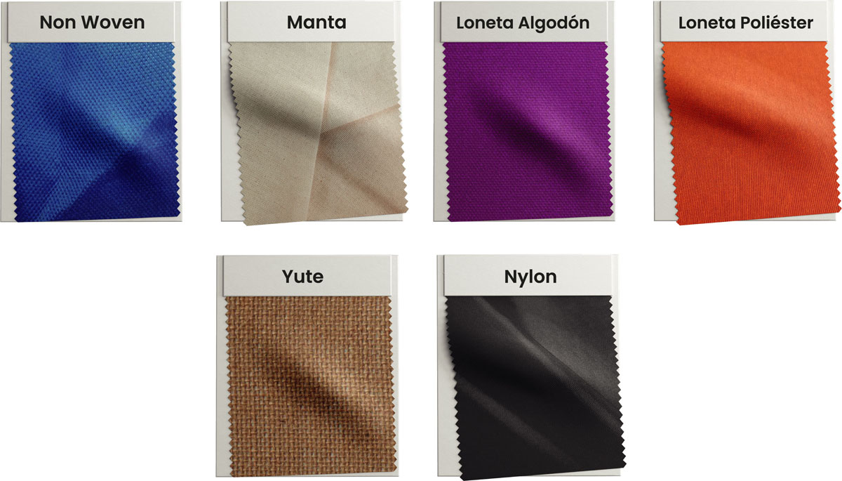 El primer paso es la elección de la tela en la que se armará tu bolsa. Puedes elegir entre más de 6 opciones. Solicita a tu ejecutivo la paleta de colores disponibles. Recuerda que las telas manta y yute solamente tienen existencia en color crudo natural.