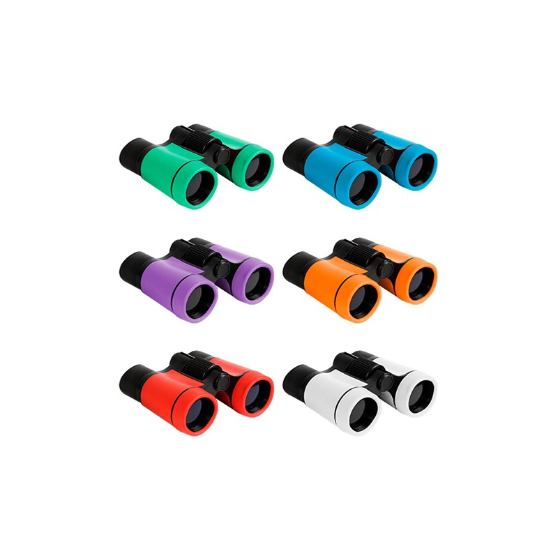 Binoculares con cuerpo de ABS y detalles en silicón. Incluye estuche.