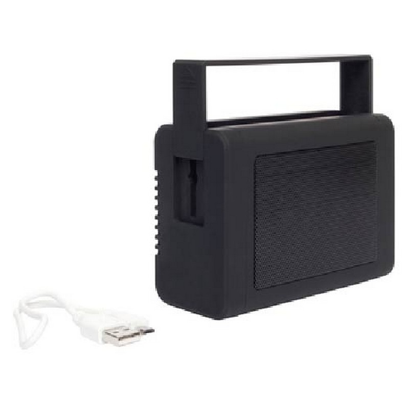 Bocina de plástico engomado. Bocina bluetooth. En uno de los extremos botones de volumen, encendido, altavoz y radio FM. Salida USB, Auxiliar, TF card y mini USB. Compatible con Ipod, MP3, MP4 Player y celulares.