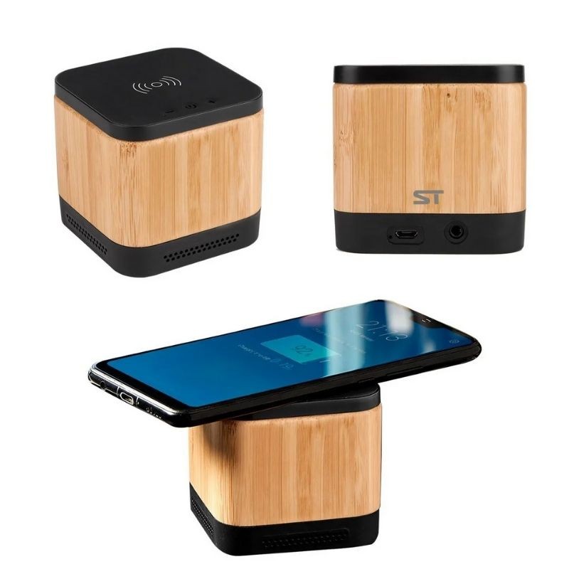 Bocina bluetooth con batería recargable de 4 hrs de reproducción aproximadamente. Incluye función de carga inalámbrica al estar conectada. Incluye cable cargador USB