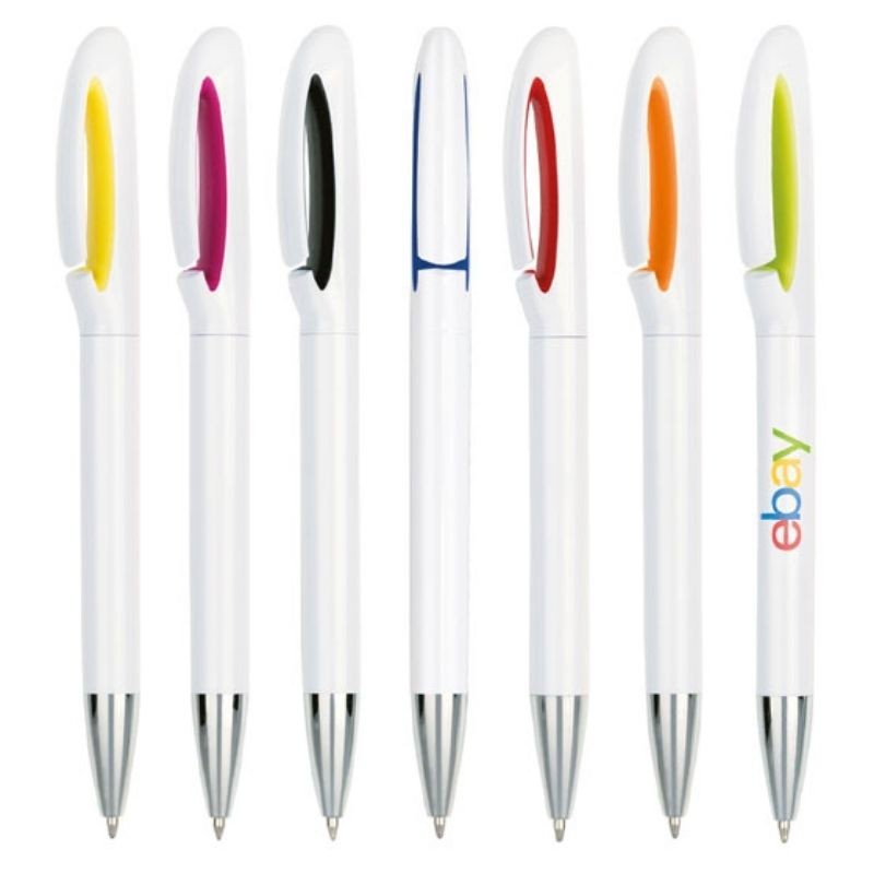 Bolígrafo de plástico, cuerpo blanco con punta cromada. Diseño de clip con detalle en color. Mecanismo retráctil.