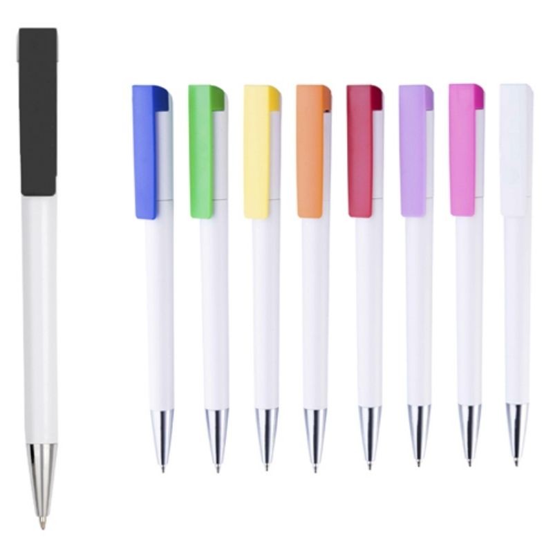 Bolígrafo retráctil. Con punta metálica y clip de colores.