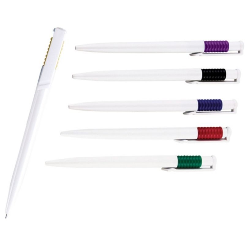 Bolígrafo de plástico, cuerpo blanco y mecanismo pulsador.