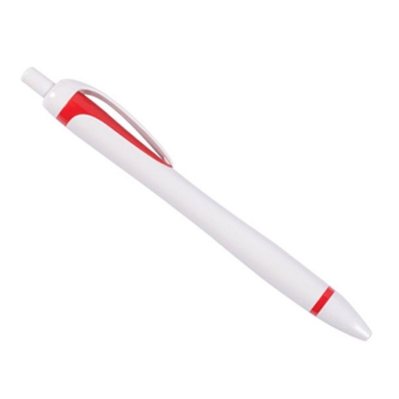 Bolígrafo plástico de cuerpo blanco. Detalle en color debajo del clip y cinturón de color. Mecanismo de click.