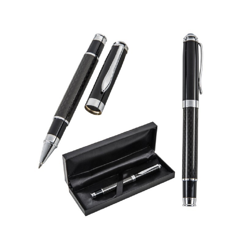 Bolígrafo de fibra de carbono con tapa metálica con estuche.