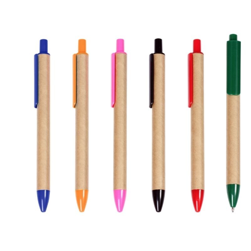 Bolígrafo ecológico, barril color cartón y accesorios de plástico con tinta negra.