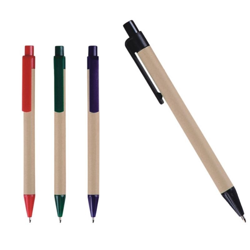 Bolígrafo de papel reciclable, clip y punta de plástico. Mecanismo de click.