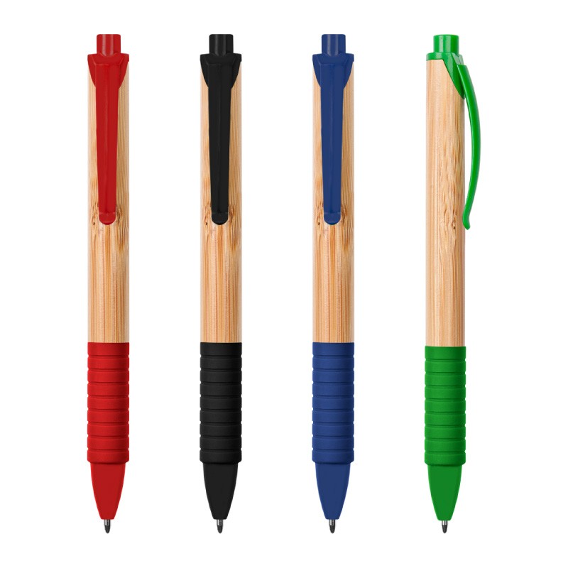 Bambú. Cuerpo color madera. Pulsador, clip y punta plástico de color, grip de goma a juego. Tinta negra.