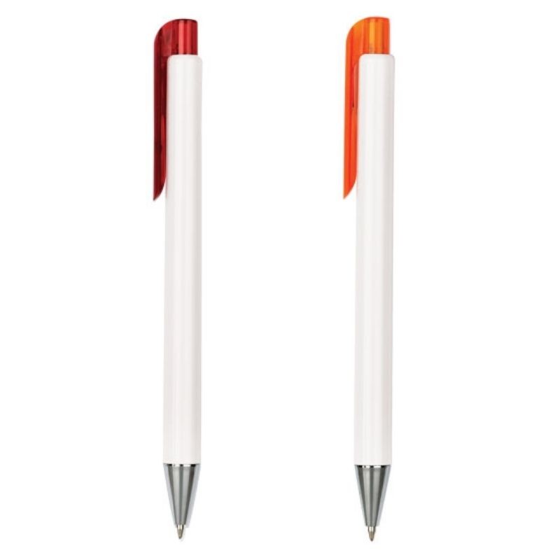 Bolígrafo plástico de cuerpo blanco y punta cromada.