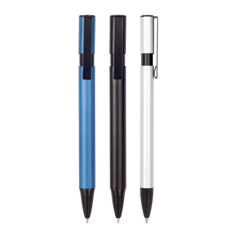 Metal. Cuerpo ovalado de color. Punta, clip y pulsador de plástico negro.