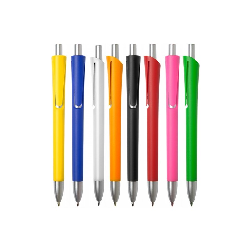 Bolígrafo con cuerpo plástico de color, botón pulsador y puntera color plata. Tinta negra.