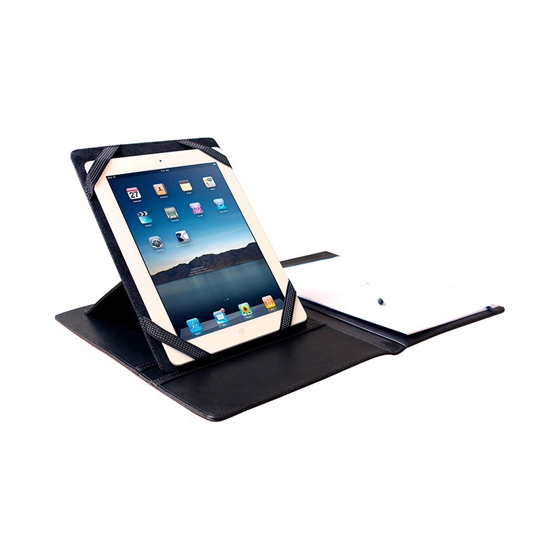 Carpeta con cubierta de fibra de vidrio y poliuretano e interiores en curpiel, porta tablet y block de 25 hojas tamaño carta.