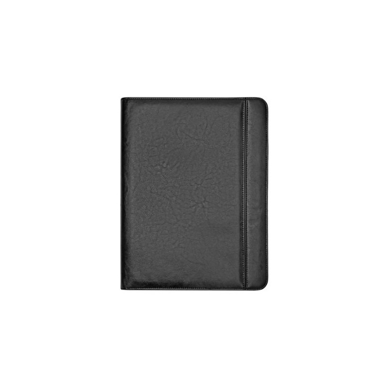 Símil cuero. Bolsillo en la parte exterior. En la parte interna cuenta con sobre para guardar tablet, soporte con velcro para tablet o celular. Porta celular, compartimento para tarjetas o documentos y tres compartimentos para guardar cables y audífono. Porta bolígrafo. Block de hojas blancas. Cierre con tirador metálico.