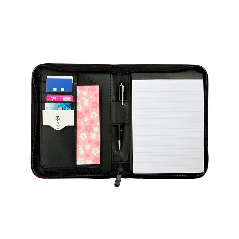 Carpeta tipo portafolio fabricada en curpiel con cierre, block de 30 hojas, porta pluma y compartimentos interiores. no incluye pluma.