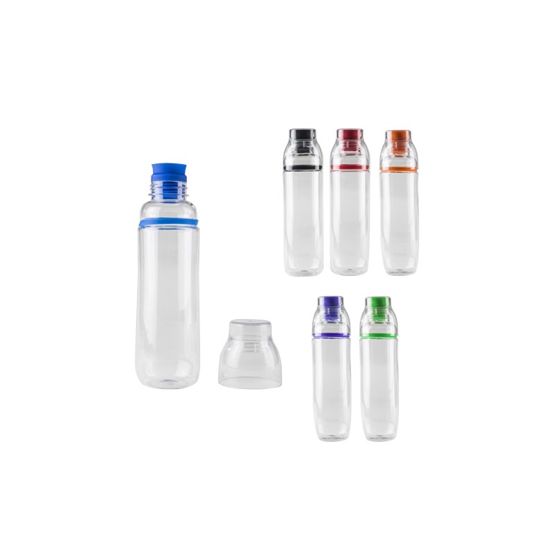 Cilindro de plástico con chupón, banda de silicón y tapa.