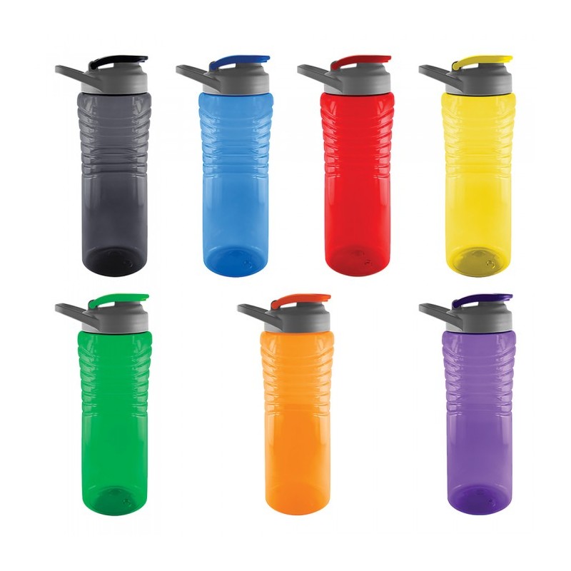 Cilindro de plástico PET con tapa antiderrames y asa sujetadora, capacidad de 750 ml.