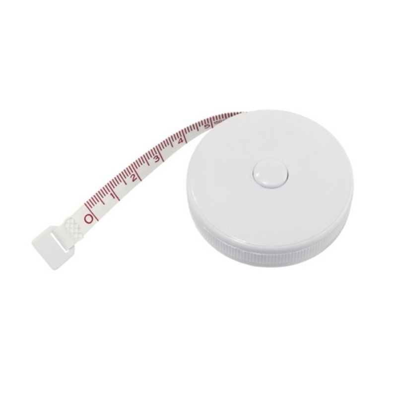 Cinta de 1,5 mts con escalas en centímetros y pulgadas. Botón de bloqueo que permite marcar medida y retraer cinta.