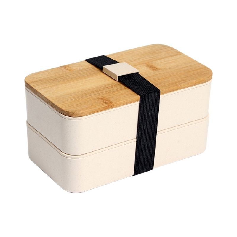 Contenedor de alimentos con dos compartimentos fabricado en fibra de trigo y tapa de bambú, incluye cubiertos de fibra de trigo.