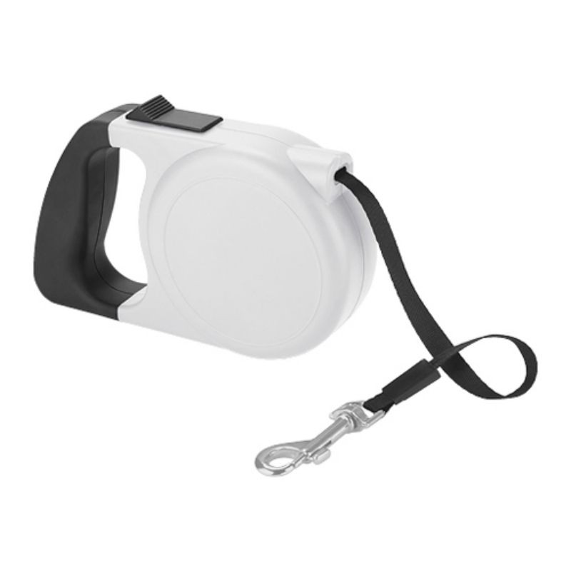 Correa retráctil con broche metálico y botón de seguridad. Longitud de la correa 5 mts.