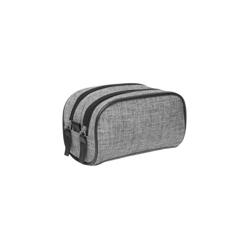 Necessaire con dos compartimentos, división movible sujeta con velcro. Interior con forro. Detalles y tirador de cierre en símil cuero.
