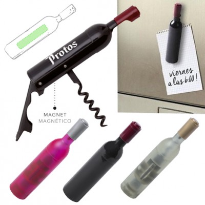 Divertido sacacorchos magnético con forma de botella de vino en diseños blanco, tinto y rosado. Con cuerpo en original acabado translúcido y función abridor Magnético.