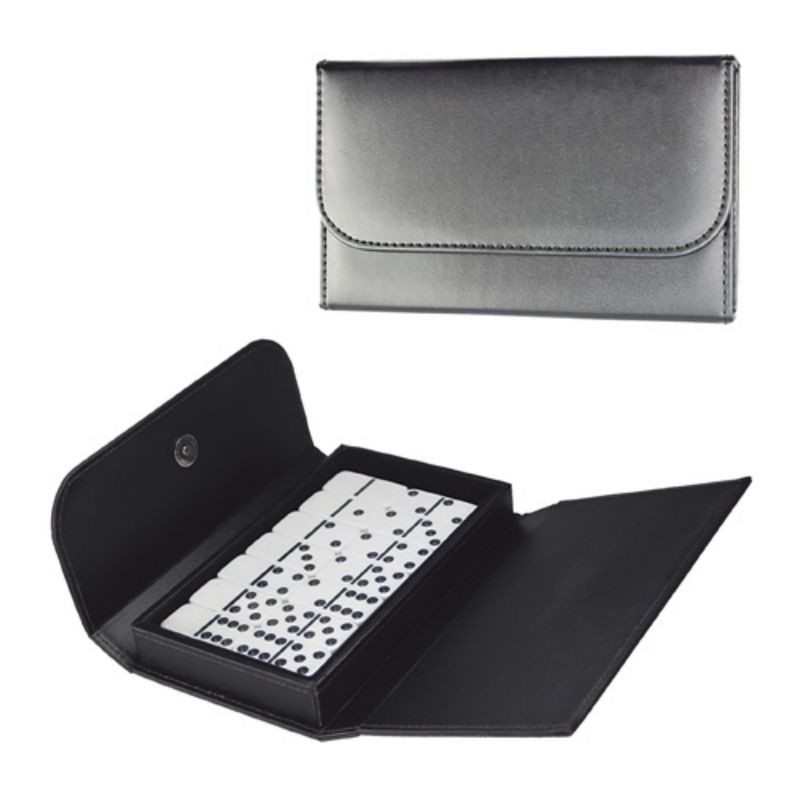 Juego de domino con fichas color blancas con negro en estuche de vinipiel.