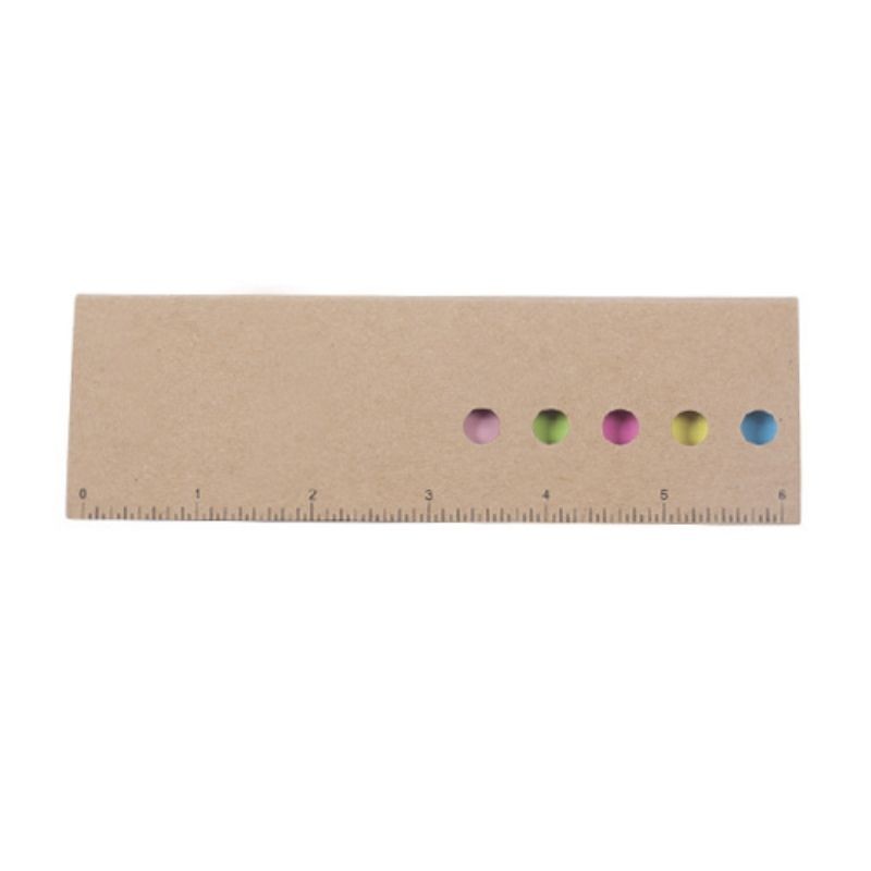 Estuche de papel reciclado con regla impresa de 6 pulgadas, incluye notas y banderas adhesivas de colores.