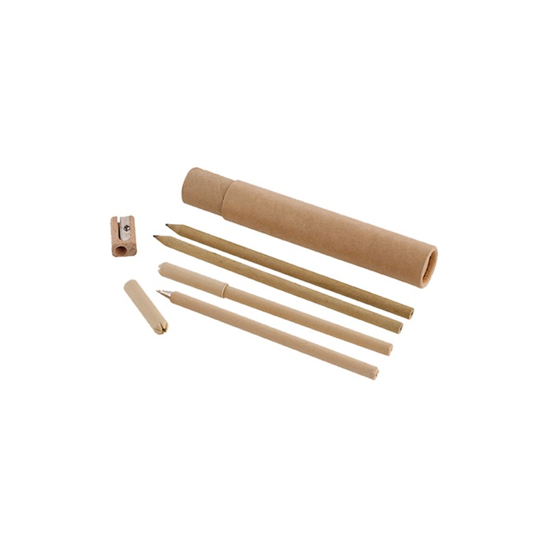 Estuche de escritura de papel reciclado con tapa. Incluye 2 lapices de madera, 2 plumas y un sacapunta.