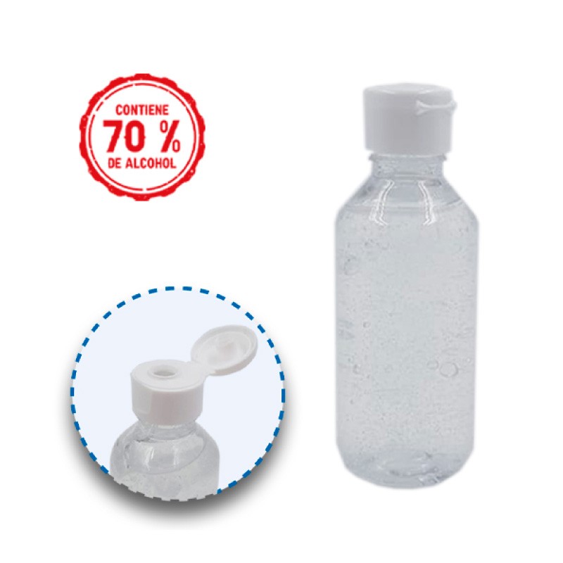 Gel antibacterial (70% alcohol) en botella de plástico con tapa flip. Cap. 120 ml