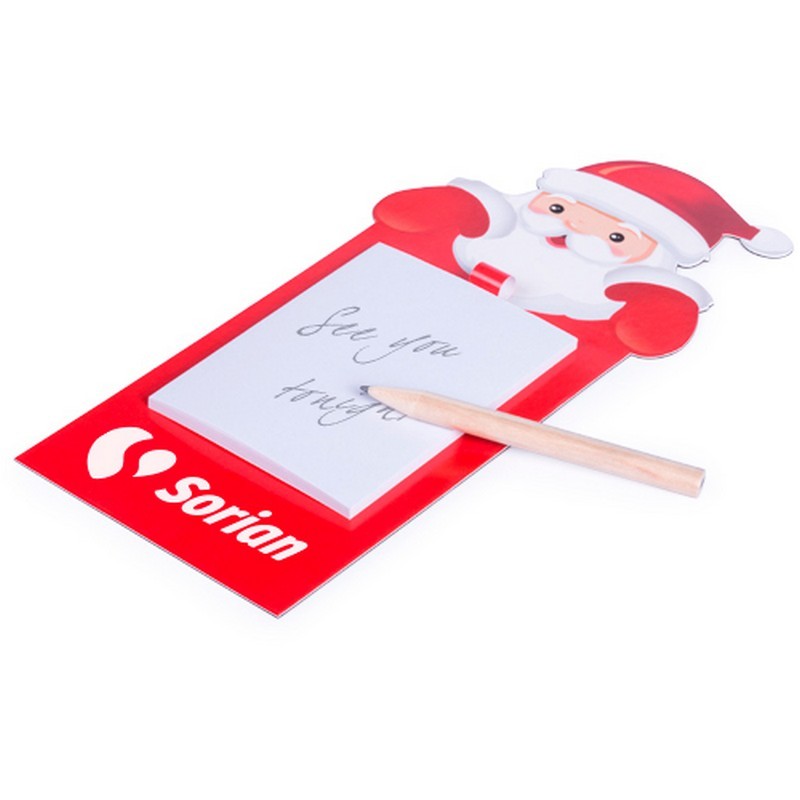 Imán con bloc de notas en divertido diseño de Papá Noel. Con 40 hojas lisas y lápiz de madera incluido.