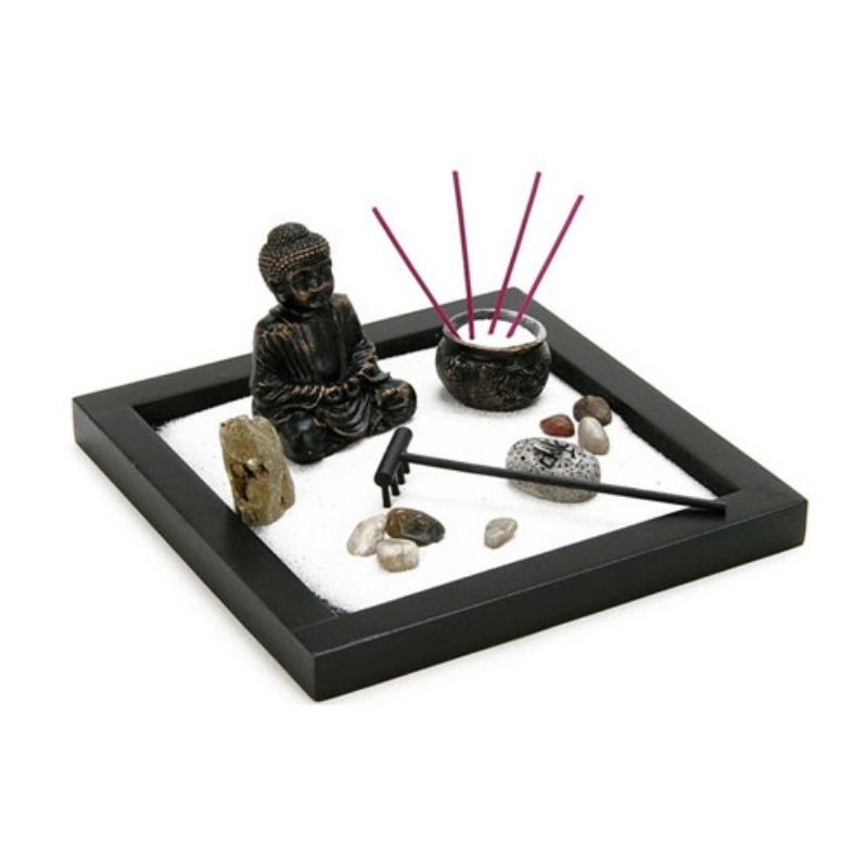 Base cuadrada de Madera o mdf. Incluye: Historia del Jardín Zen, Arena Sílica, Rastrillo de Madera y Piedra Pulida de río.