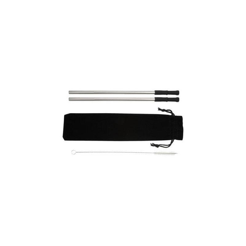 de popotes y una bolsa de terciopelo. Los popotes están hechos de acero