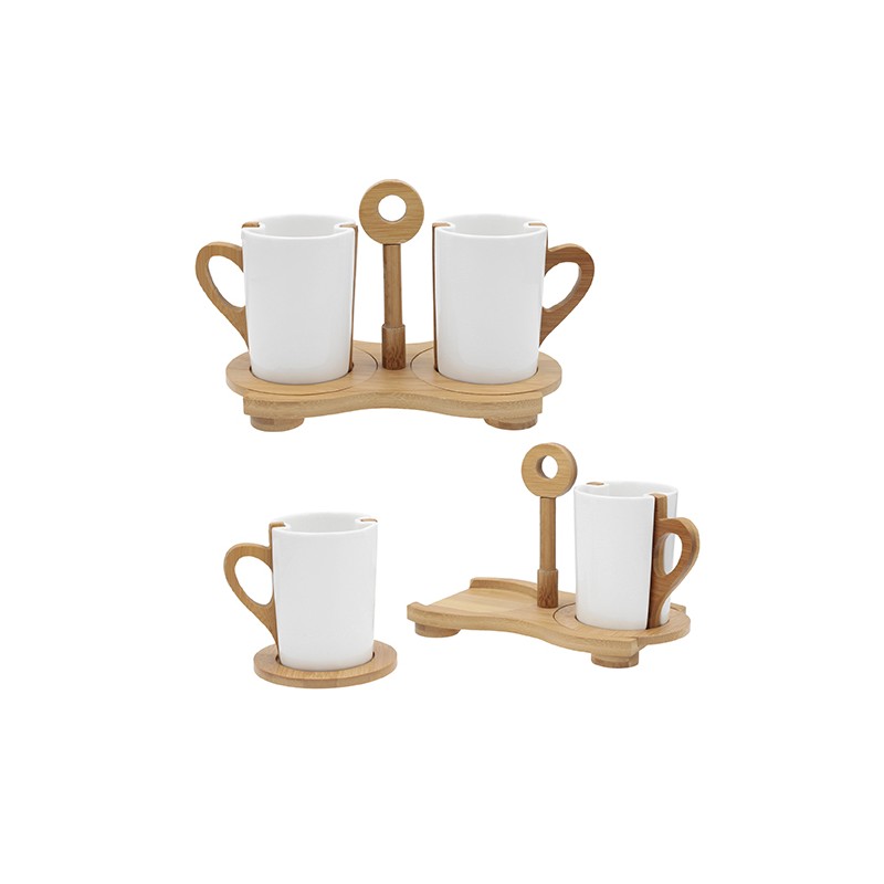 Juego de dos tazas de cerámica con asa, incluye base y dos porta tazas.