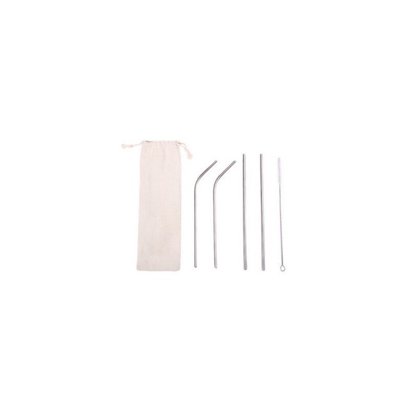 Kit ecológico de popotes de acero inoxidable. Cuenta con 2 popotes rectos, 2 curvos y 1 cepillo para limpieza de los popotes. Con estuche de algodón de jareta.