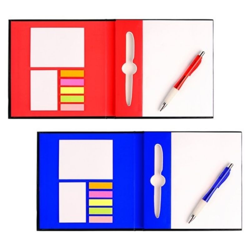 Libreta rígida de cartón negra con 100 hojas blancas y pluma tinta azul, notas adhesivas (50 blancas) y banderitas de colores (125 en 5 colores), interiores en color.