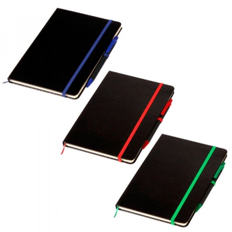 Libreta de pasta rígida con 80 hojas de raya, pluma tinta negra, separador de hojas y banda elástica sujetadora de pastas.