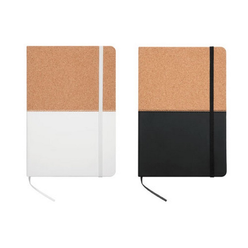 21 x 14,2 x 1,3 cm (cerrado) 21 x 28 x 1,3 cm. (abierta) Libreta de símil corcho y PU con detalle de costura. 80 hojas con renglones punteados, señalador de tela y elástico de color que cierra o sostiene la hoja.