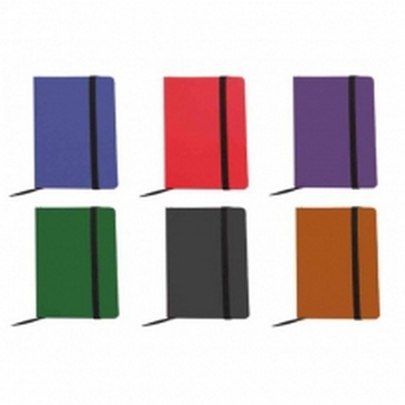 Libreta cosida con forros en papel satín. Con 80 hojas rayadas, banda elástica y separador.