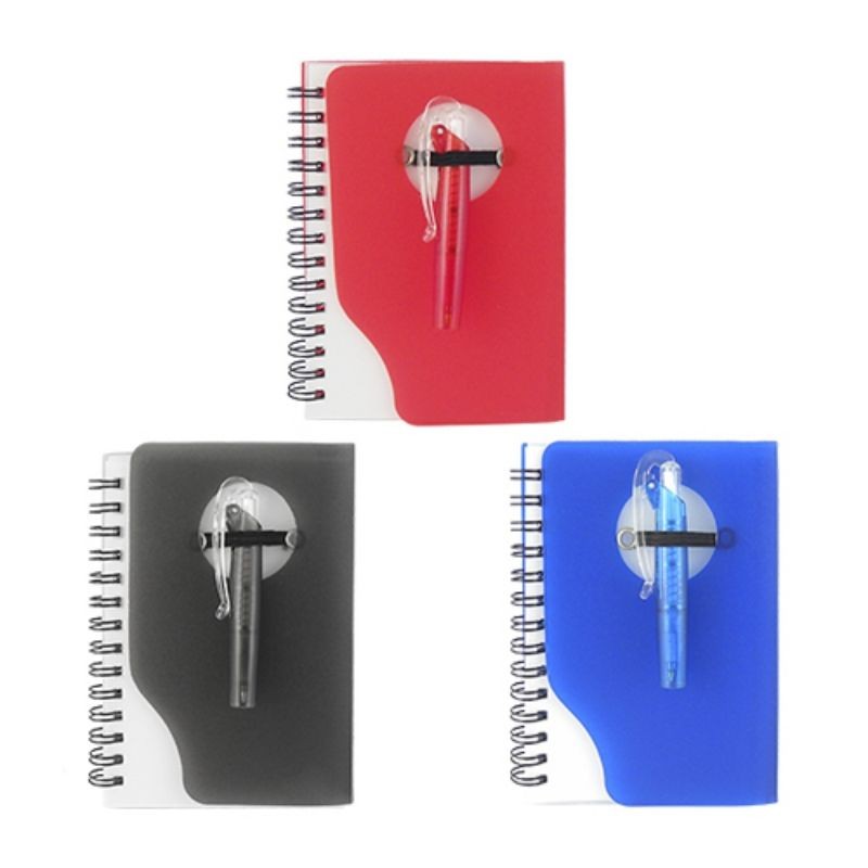 Libreta de plástico con bolígrafo.