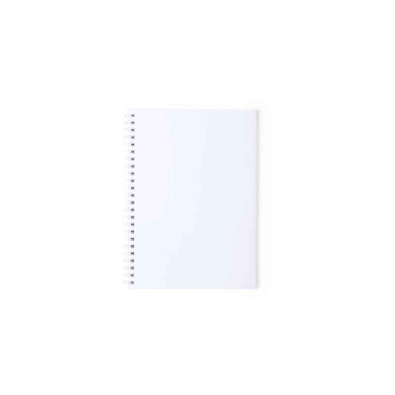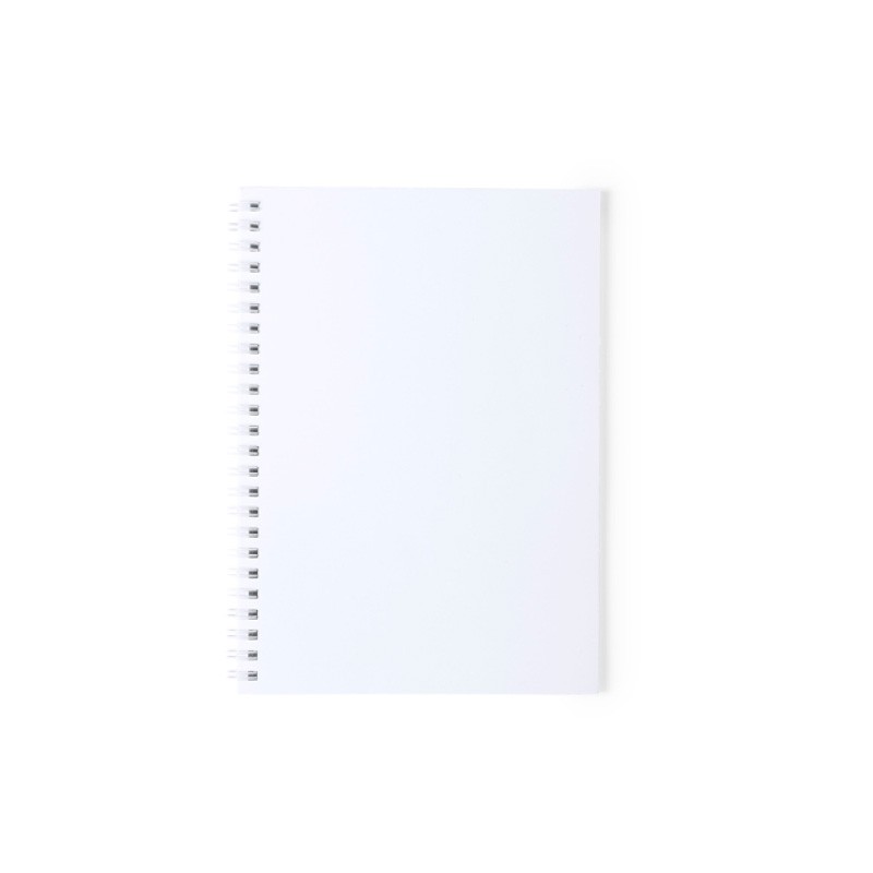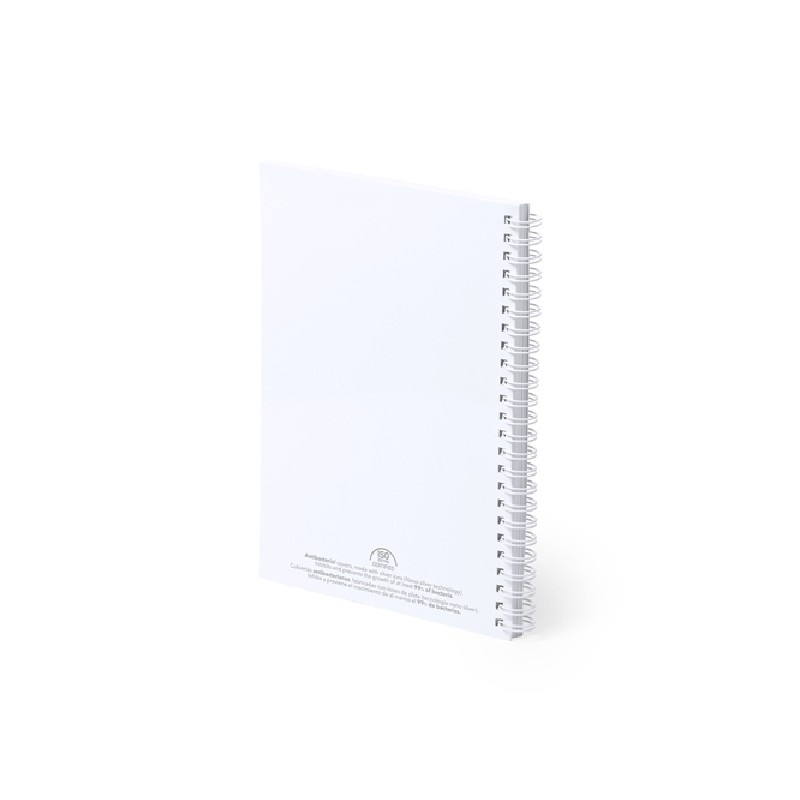 Libreta tamaño A5 con tapas antibacterianas flexibles de cartón laminado. En elegante acabado blanco mate, con anillas a juego.