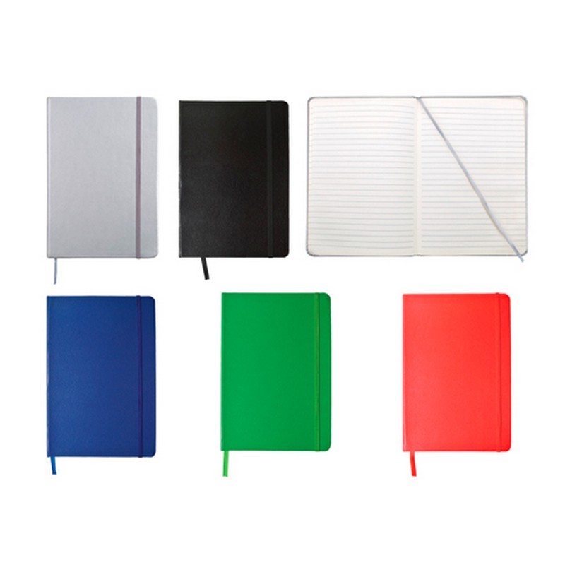 Libreta de pasta dura, con forro plástico. Incluye listón como separador y banda elástica para sujetar cubierta.