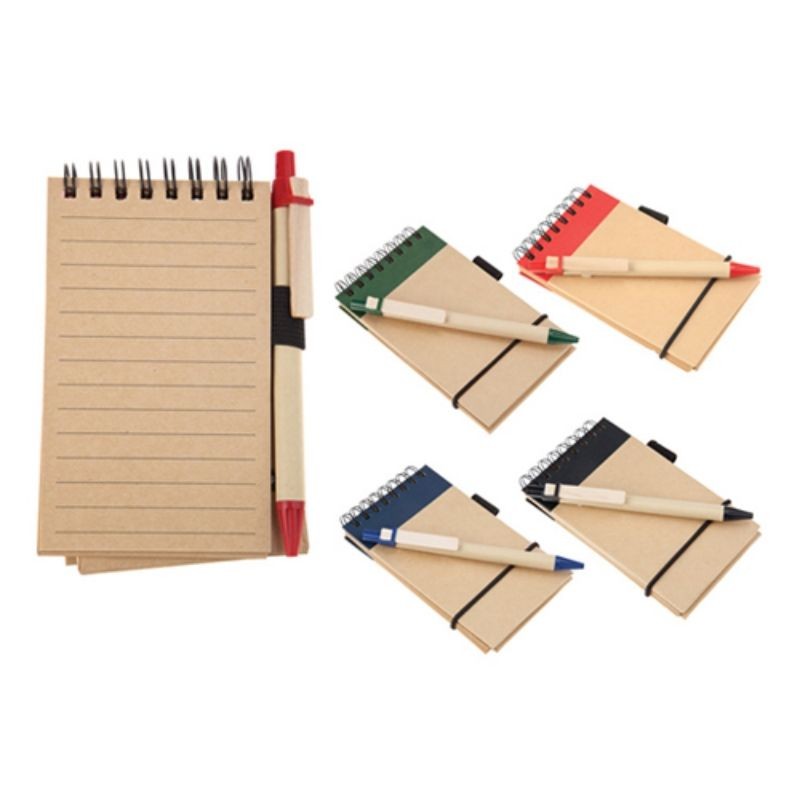 Libreta de papel reciclado con cinta elástica. Incluye pluma de papel con clip de madera.