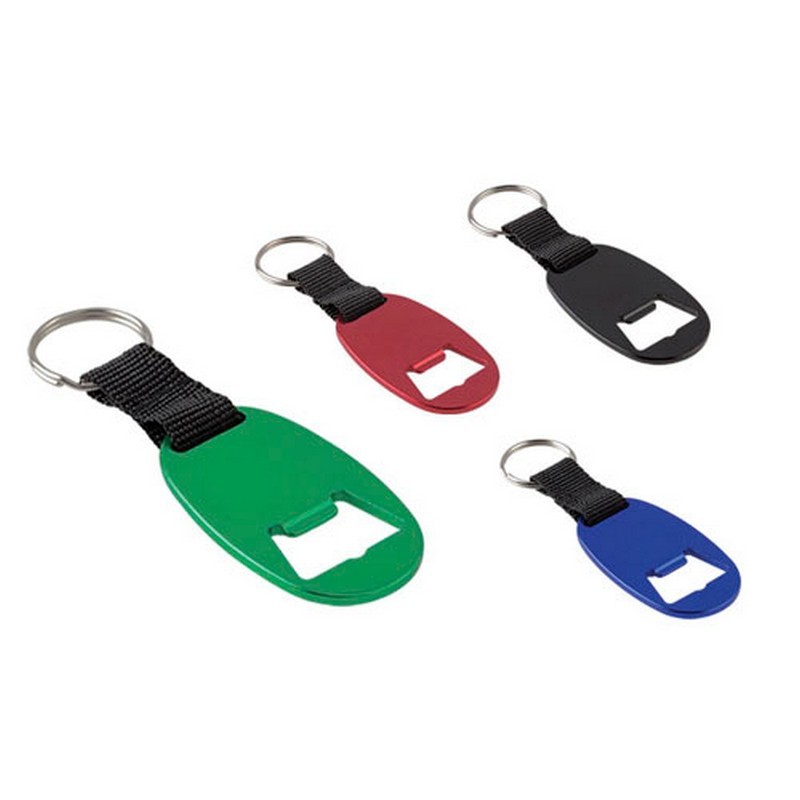 Llavero destapador en color metalizado con cinta y arillo para colgar.