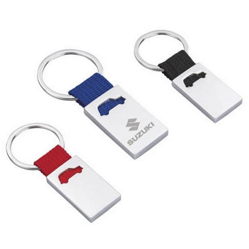 Llavero metálico con figura de auto y arillo reforzado.