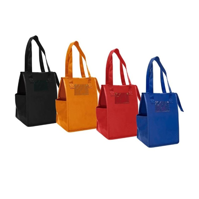 Lonchera con asa para fácil agarre, malla lateral, cierre y compartimento translúcido para guardar identificación.