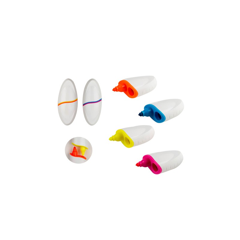 Marcador en forma de cápsula que contiene dos plumones de diferente color en tinta fosforescente.