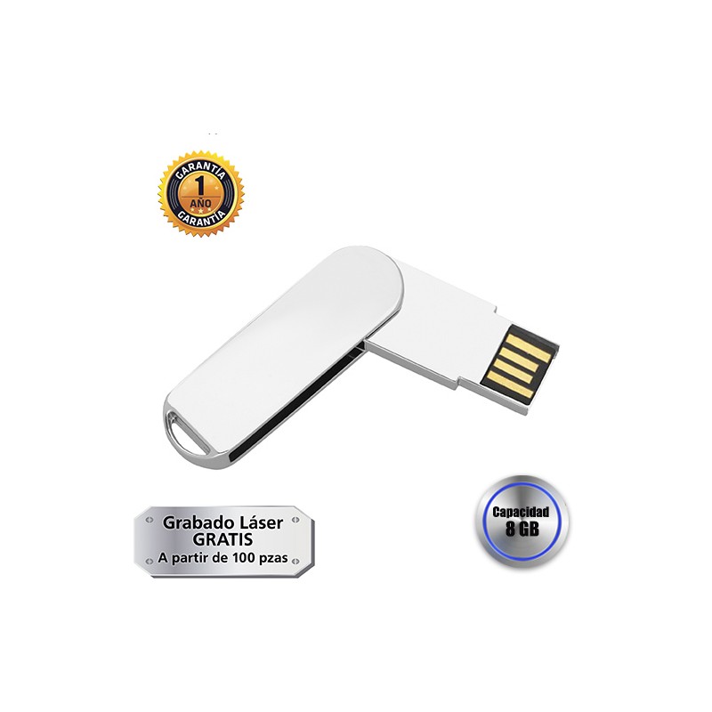 Memoria USB acabado metálico con protector giratorio. Cap. de 8 GB.