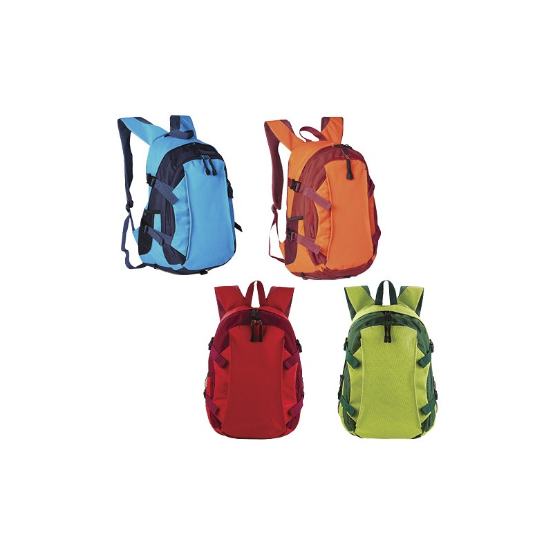 Mochila con bolsa featured y frontal. Bolsas laterales de malla. Espacio para laptop.