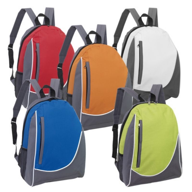 Bolsillo frontal con cierre, vivos blancos. Un compartimento featured. Correas regulables herrajes plásticos.