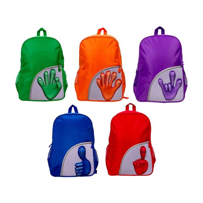 Mochila con diseños de SMILE HANDS fabricada en microfibra con detalles en el cierre y efecto de 3D en la mano.